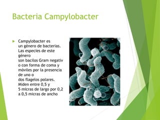 La bacteria Campylobacter es un género de bacterias Gram negativas con forma de coma que se encuentra comúnmente en animales. Se cultiva mejor a temperaturas entre 37-42°C en medios selectivos. Las infecciones por Campylobacter causan diarrea, fiebre y dolor abdominal durante 2-5 días y rara vez pueden producir complicaciones como artritis reactiva.