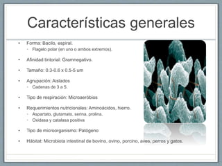 Campylobacter jejuni es un bacilo gramnegativo, microaeróbico, que se encuentra en la microbiota intestinal de varios animales y puede causar enfermedades como enterocolitis y gastroenteritis, manifestándose con diarrea acuosa, fiebre y dolor abdominal. Su transmisión ocurre principalmente por la ingestión de carne de pollo contaminada y es una de las principales causas de gastroenteritis en los países desarrollados. El diagnóstico se realiza a través de pruebas de laboratorio y su tratamiento se enfoca en la rehidratación, ya que los antibióticos no siempre son necesarios.