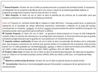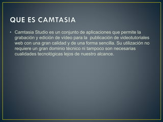 Camtasia Studio es un software que permite grabar la pantalla del ordenador y editar videos de alta calidad para crear tutoriales web de forma sencilla. Incluye cinco aplicaciones como Camtasia Recorder para grabar la pantalla, presentaciones y webcam, Camtasia Audio Editor para editar audio, y Camtasia Theater y Player para ver y compartir los videos creados. La interfaz principal está dividida en menú, área para clips de video e imágenes, vista previa y línea de tiempo para montar el video.