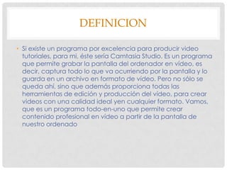 Camtasia es un programa todo-en-uno que permite grabar la pantalla del ordenador en video y editarlo con herramientas profesionales para crear videos tutoriales de alta calidad en diferentes formatos de manera sencilla y rápida. El programa captura todo lo que ocurre en la pantalla y lo guarda en archivos de video que pueden ser editados, reproducidos en cualquier tamaño, y compartidos fácilmente.