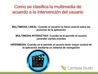 La multimedia consiste en el uso de varios tipos de medios como texto, gráficos, audio y video para transmitir información. Puede ser lineal, interactiva o hipermedia dependiendo del nivel de control del usuario. Tiene ventajas como mejorar la retención de información y hacerla más entretenida. Se usa en construcciones, medicina, educación y comunicaciones. Incluye gráficos, imágenes, animación y video.