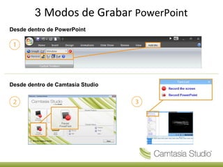Este documento describe 3 métodos para grabar una presentación de PowerPoint: 1) directamente desde PowerPoint, 2) desde Camtasia Studio dentro de PowerPoint, y 3) cómo grabar durante, después y cancelar una grabación desde Camtasia Studio. Se proporcionan instrucciones detalladas sobre cómo configurar y realizar cada método de grabación.