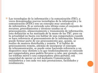 Las tecnologías de la información y la comunicación (TIC) se originaron gracias a la invención de las computadoras y el desarrollo de Internet, lo que permitió un mayor acceso a la información. Si bien las TIC traen beneficios como la motivación y el aprendizaje colaborativo, también conllevan riesgos como la distracción, la adicción y problemas de salud. El Ministerio de Tecnologías de la Información y las Comunicaciones de Colombia busca promover el desarrollo del sector de las TIC y su contribución a