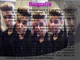 Justin Bieber nació en 1994 en Canadá. Desde niño mostró interés por la música y aprendió a tocar varios instrumentos de forma autodidacta. A los 12 años obtuvo el segundo lugar en un concurso de canto y su madre subió un video a Youtube que llamó la atención de Scooter Braun y Usher, lo que le permitió firmar un contrato discográfico en 2008. Su primer sencillo "One Time" tuvo éxito en 2009 y su álbum debut My World también logró buenas ventas. En 2010, el sencillo "Baby