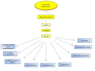 Este documento presenta una teoría de las organizaciones que incluye nueve unidades principales: 1) el surgimiento de la teoría contemporánea, 2) la teoría de la contención, 3) la administración por objetivos, 4) el benchmarking, 5) el empoderamiento, 6) la calidad total, 7) la gestión del conocimiento, 8) el pensamiento complejo y 9) la proactividad. El mapa conceptual es una herramienta que representa conocimiento organizado de manera jerárquica a través de conceptos conectados por palabras de enlace para form