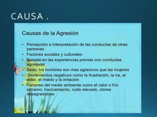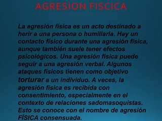 El documento habla sobre los tipos de agresión física y las consecuencias de la violencia. La agresión física puede incluir contacto físico para herir o humillar a alguien, aunque también puede tener efectos psicológicos. Las consecuencias de la violencia incluyen violencia física, feminicidio, violencia psicológica, violencia mediática, y otros tipos de violencia contra las mujeres.