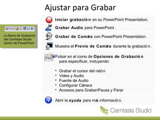 Este documento describe 3 métodos para grabar una presentación de PowerPoint: 1) directamente desde PowerPoint, 2) desde Camtasia Studio mientras se reproduce la presentación, y 3) grabando la pantalla, audio y video de la presentación desde Camtasia. Explica los pasos para configurar y realizar una grabación, incluida la opción de grabar el cursor del mouse, audio y video. También cubre cómo detener, guardar y editar una grabación completada.