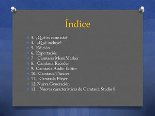Camtasia Studio 8 es un software de edición y grabación de video que permite grabar la pantalla, editar videos con funciones como zoom y transiciones, y exportar videos a diferentes formatos. Incluye utilidades como Camtasia Recorder para grabar la pantalla, Camtasia Audio Editor para editar audio, y Camtasia Theater para crear menús de DVD. La nueva versión 8 agrega características como línea de tiempo multi-pista, biblioteca de activos mejorada, animación de contenido, efectos visuales, interactividad y un asistente de producción mejorado.