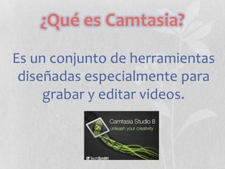 Camtasia es un conjunto de herramientas para grabar y editar videos, permitiendo la captura de pantalla, audio, y la integración de presentaciones. Ofrece funciones avanzadas de edición, opciones de exportación a múltiples formatos y permite la creación de menús para CD/DVD. Con la versión 8, se mejoran la calidad de video, la línea de tiempo de edición y se incorporan elementos interactivos para cautivar a la audiencia.