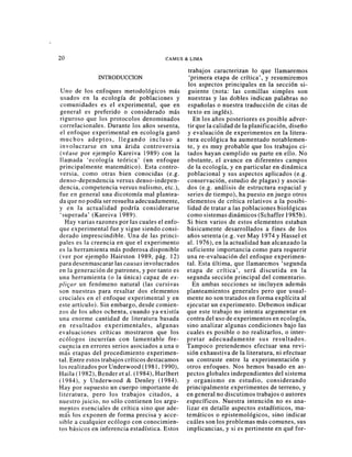 Este documento discute dos etapas de crítica del enfoque experimental en ecología. La primera etapa de crítica se centró en errores estadísticos comunes como el uso incorrecto de análisis de varianza. La segunda etapa de crítica considera factores como la complejidad de la dinámica de poblaciones y la estructura espacial, que comprometen la validez de los experimentos. Finalmente, el documento argumenta que no hay una relación necesaria entre el uso de experimentos, el establecimiento de causalidad y la obtención de