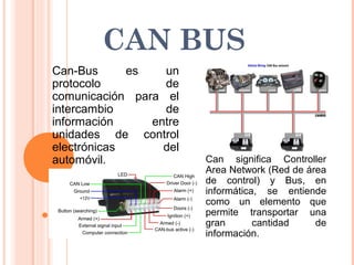 El documento describe el protocolo de comunicaciones CAN-Bus utilizado en los automóviles para intercambiar información entre las unidades electrónicas de control. CAN-Bus permite compartir gran cantidad de datos entre las unidades y reducir cables, a la vez que aumenta las funciones en los sistemas del vehículo. La información se transmite a través de dos cables en forma de paquetes de bits con identificadores de prioridad.