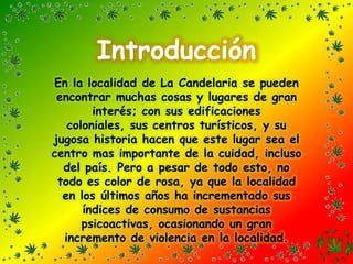 El documento describe un proyecto de investigación sobre el consumo y venta de sustancias psicoactivas en la localidad de La Candelaria. El objetivo es investigar qué tan frecuente es el consumo y expendio de estas sustancias en la localidad, con el fin de concientizar a la comunidad y proponer ideas para reducir estos índices. Para recolectar datos se aplicó una encuesta de 11 preguntas cerradas a 75 personas de la localidad.
