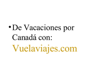 Este documento promociona un viaje a Canadá organizado por la agencia de viajes Vuelaviajes.com. Ofrece paquetes turísticos completos para visitar diferentes ciudades y destinos naturales de Canadá, incluyendo vuelos, hoteles, traslados y actividades.