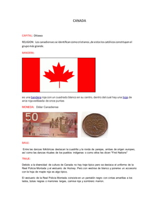 Canadá tiene como capital Ottawa. La religión predominante es el cristianismo, especialmente el catolicismo. Su bandera consiste en una hoja de arce roja sobre un fondo blanco y rojo. La moneda canadiense es el dólar canadiense. Algunos bailes típicos son la cuadrilla y la ronda, mientras que no existe un traje nacional único aunque la ropa de la Real Policía Montada y el uniforme de hockey son reconocibles. La gastronomía canadiense incluye platos como el tourtière, la poutine