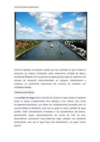 El documento describe diferentes tipos de canales artificiales, incluyendo canales de navegación que conectan cuerpos de agua y canales de riego usados para transportar agua a los cultivos. Destaca la importancia histórica y económica de grandes canales como el de Suez y el de Panamá. Además, menciona la construcción y el diseño de alcantarillas y ductos para el paso de agua.