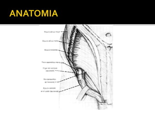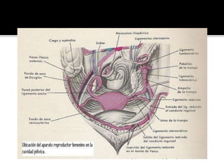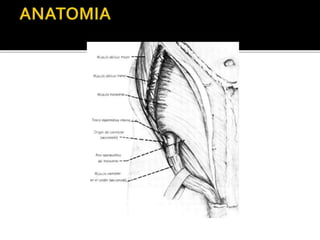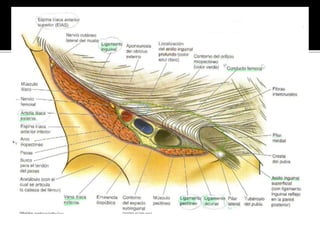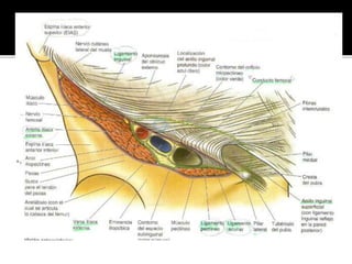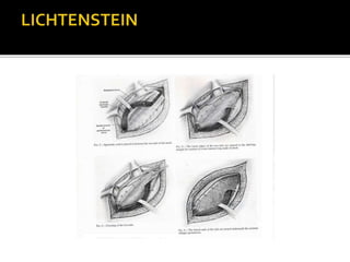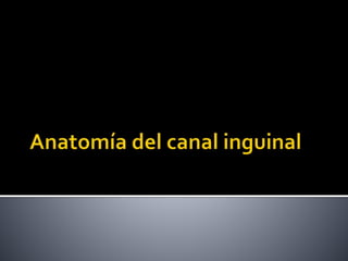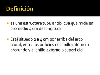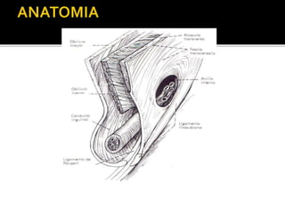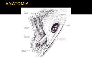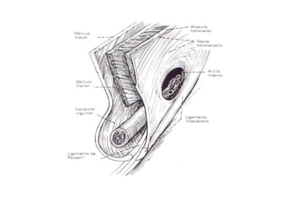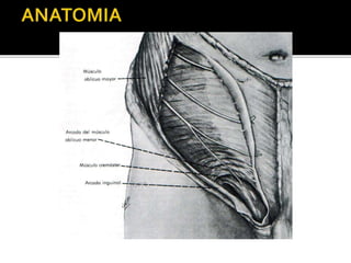 La hernia inguinal es una protrusión del contenido abdominal a través de la ingle que ocurre cuando aumenta la presión intraabdominal. Se clasifican en directas e indirectas. El diagnóstico se realiza mediante inspección y palpación bimanual. El tratamiento quirúrgico busca suprimir el saco herniario y reconstruir la pared abdominal mediante técnicas anatómicas o el uso de mallas. Las complicaciones incluyen atascamiento, estrangulación y efectos adversos quirúrgicos.