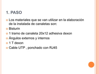 El documento describe los pasos para instalar canaletas para cables en una sala de sistemas de un colegio. Incluye medir las áreas, cortar tramos de canaleta a las medidas correctas usando ángulos externos, internos y en T, e instalar la canaleta para enrutar cables de red de manera ordenada.