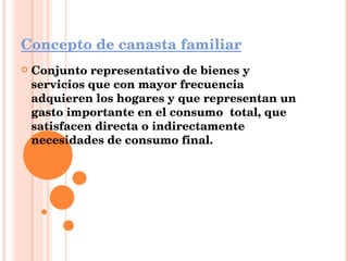 El documento resume la situación de la canasta familiar y la inflación en Perú. Reporta que en agosto de 2008, el Índice de Precios al Consumidor aumentó 0.67% a nivel nacional, influenciado principalmente por el aumento de precios de los alimentos como resultado de factores estacionales y el incremento en los precios de los combustibles. También señala que los mayores aumentos de precios se registraron en alimentos y bebidas, transporte y comunicaciones, y alquiler de vivienda.