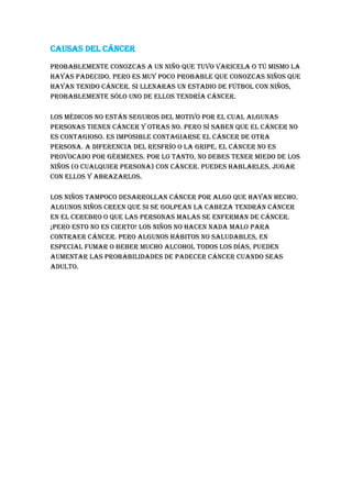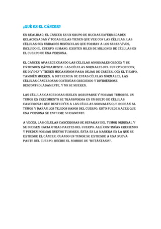 El documento explica qué es el cáncer. Señala que el cáncer se produce cuando las células crecen y se dividen de forma anormal y descontrolada, formando tumores que pueden extenderse a otras partes del cuerpo. Describe que aunque los médicos no conocen todas las causas del cáncer, este no es contagioso como otros males y que los niños no desarrollan cáncer por algo que hayan hecho.