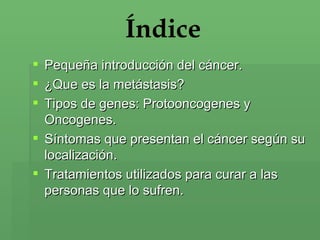 Este documento resume información sobre el cáncer, incluyendo sus causas, síntomas según la localización, y tratamientos comunes. Explica que el cáncer se produce por factores ambientales y genéticos que causan un crecimiento celular anormal. Describe tratamientos como cirugía, radioterapia, quimioterapia y terapia hormonal, y sus objetivos de extirpar, destruir o inhibir las células cancerosas. Resalta que la detección temprana mejora el pronóstico de la mayoría de los