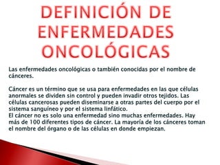 Este documento define las enfermedades oncológicas o cáncer, explicando que son el crecimiento anormal e incontrolado de células que pueden extenderse a otros órganos. Describe cuatro tipos comunes de cáncer - mama, colon, próstata y piel - y sus síntomas, factores de riesgo y tratamientos como cirugía, quimioterapia y radioterapia. El documento también cubre temas como biopsias, estadificación y metástasis para diagnosticar y tratar diferentes tipos de cáncer