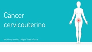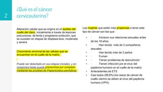 El documento describe el cáncer cervicouterino, incluyendo su definición como un crecimiento anormal de células en el cuello de la matriz, sus causas como mutaciones en el ADN que pueden ser causadas por el virus del papiloma humano, y sus métodos de detección, diagnóstico, tratamiento y prevención, como las pruebas de Papanicolaou y la vacuna contra el VPH.