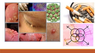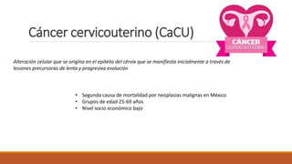 Este documento describe el cáncer cervicouterino, la segunda causa de mortalidad por cáncer en México. Explica que el principal factor de riesgo es la infección por el virus del papiloma humano, especialmente los tipos 16 y 18. También señala otros factores como el tabaquismo, la inmunodepresión y la promiscuidad sexual. Detalla pruebas como el Papanicolaou, la colposcopia y la biopsia que se usan para el diagnóstico. Finalmente, resume los tratamientos disponibles que dependen del estadio del c