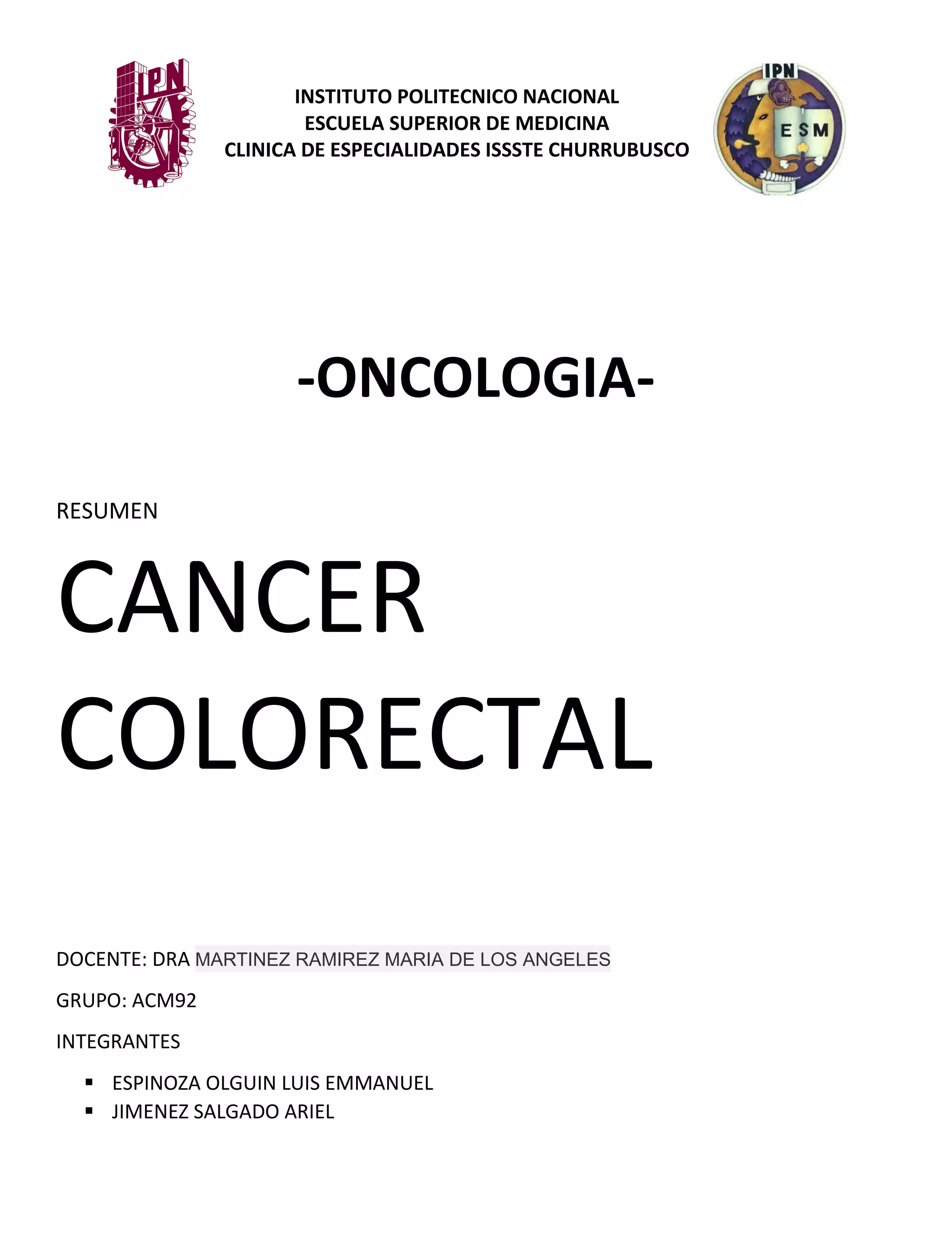 Este documento resume información sobre el cáncer colorrectal, incluyendo su epidemiología, factores de riesgo, manifestaciones clínicas, diagnóstico, estadificación, tratamiento quirúrgico y de quimioterapia, pronóstico y prevención. El cáncer colorrectal es el segundo cáncer más común y una de las principales causas de muerte por cáncer. Su incidencia aumenta con la edad y está asociada con factores como tabaquismo, obesidad, dieta y antecedentes familiares o de