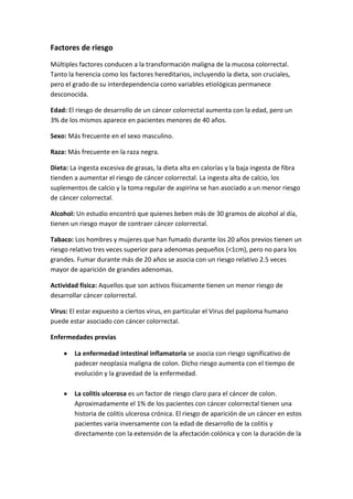 El documento describe la anatomía y factores de riesgo del cáncer colorrectal. El colon se extiende desde la válvula ileocecal hasta el ano y se divide en colon derecho e izquierdo. Factores como la edad, sexo, dieta, enfermedades previas y factores genéticos aumentan el riesgo de desarrollar este cáncer. Los síntomas varían dependiendo de la ubicación del tumor pero incluyen cambios en los hábitos intestinales, sangrado rectal y dolor abdominal.