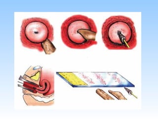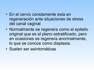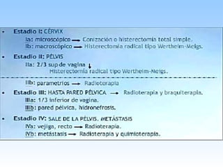 El documento describe el cáncer de cuello uterino. Explica que la citología cervical es el método más efectivo para la detección temprana antes de la invasión, aunque tiene una sensibilidad baja. Recomienda realizar la prueba a partir de los 18 años de forma periódica. También cubre la propagación, estadificación, factores de pronóstico y tratamientos del cáncer cervical en función del estadio.