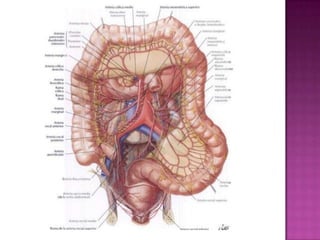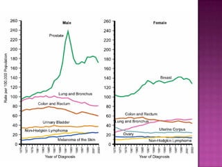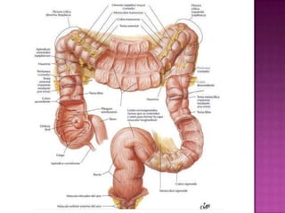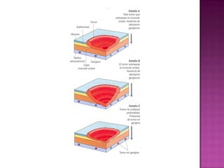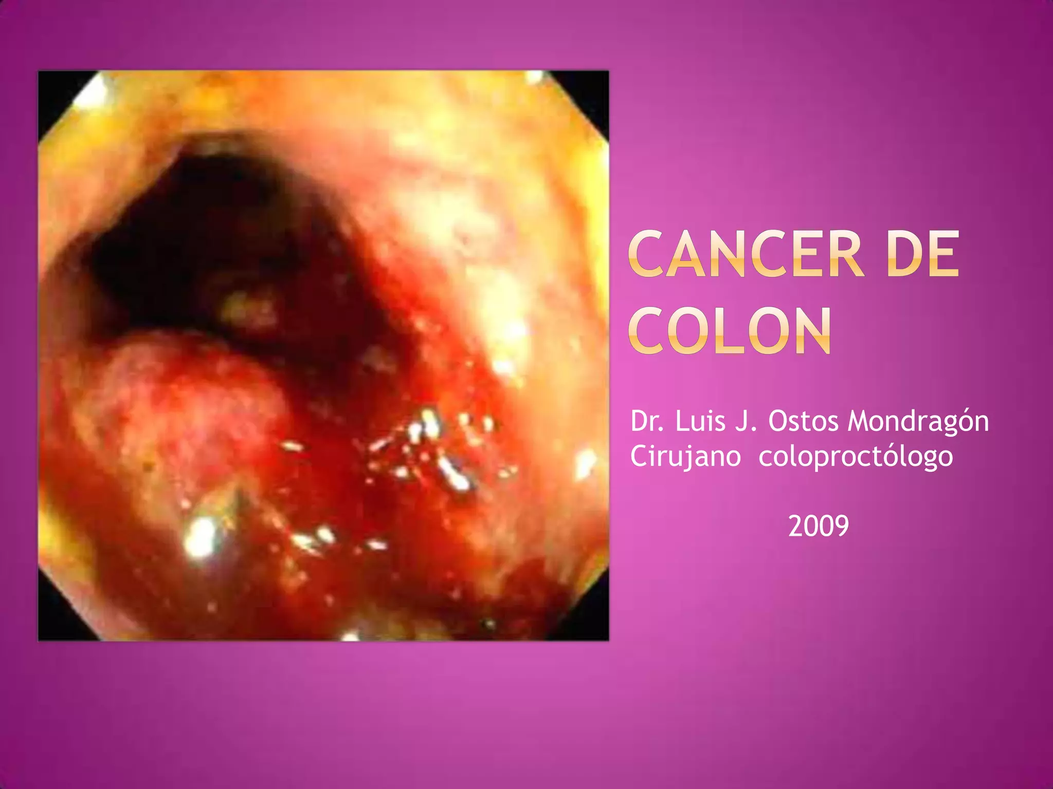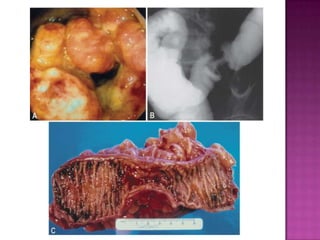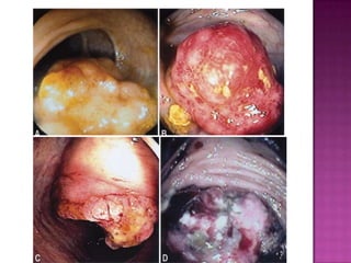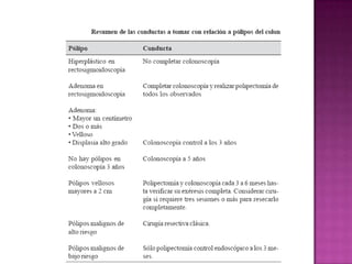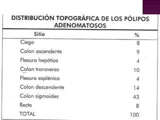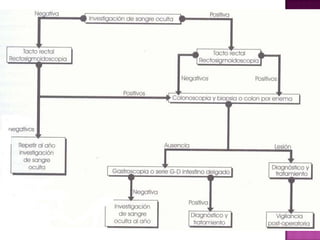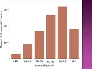 Este documento resume información sobre el cáncer colorrectal, incluyendo su frecuencia, etiología, manifestaciones clínicas, evaluación, anatomía patológica, clasificación, tratamiento y prevención. El cáncer colorrectal es el tercer cáncer más común y se desarrolla a partir de pólipos adenomatosos en el colon. Los factores de riesgo incluyen dieta, tabaquismo, enfermedades inflamatorias intestinales y antecedentes familiares. La evaluación incluye exámenes de sangre