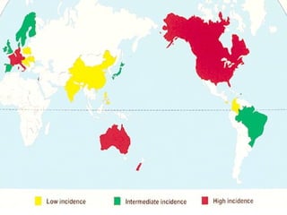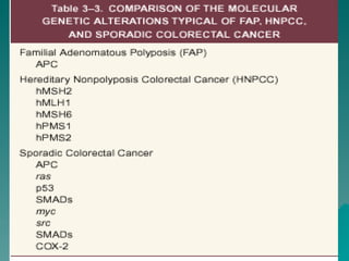Este documento describe el cáncer colorrectal. Es la segunda causa de muerte por cáncer en los Estados Unidos, con aproximadamente 131,000 nuevos casos y 54,600 muertes por año. Los factores de riesgo incluyen la edad, la raza, la historia familiar, la dieta y el tabaquismo. El diagnóstico se realiza mediante exámenes de sangre oculta en heces, tacto rectal, colonoscopia y TAC. El tratamiento involucra cirugía, quimioterapia y radioterapia según