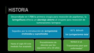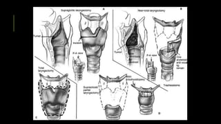 Este documento describe la historia, anatomía, epidemiología, clasificación, diagnóstico y tratamiento del cáncer de laringe. Se discuten los avances en la cirugía preservadora de la laringe y las técnicas quirúrgicas para el tratamiento del cáncer de laringe en diferentes regiones anatómicas. También se proporciona información sobre los factores de riesgo, patrones de diseminación, pronóstico y clasificación TNM de esta enfermedad.