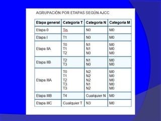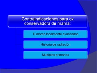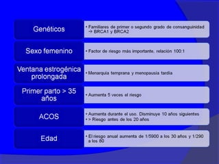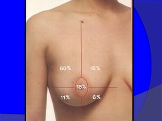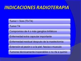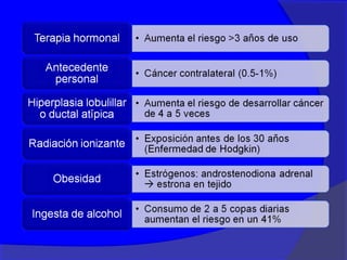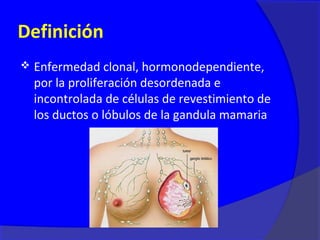 Este documento presenta información sobre el cáncer de mama, incluyendo su definición, epidemiología, factores de riesgo, diagnóstico, tipos histológicos, factores pronósticos, tratamiento y seguimiento. Define el cáncer de mama como una enfermedad hormonodependiente causada por la proliferación anormal de células mamarias. Describe los diferentes estadios y factores que afectan el pronóstico como el tamaño del tumor, compromiso ganglionar e histopatología. Explica los diferentes tip