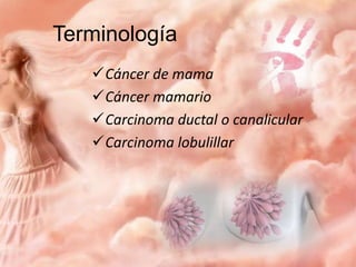 El documento define los términos relacionados con el cáncer de mama, describe cómo se forman las células cancerosas y cómo se propagan. Explica la anatomía de la mama, los factores de riesgo, las etapas y clasificaciones del cáncer de mama, los síntomas, los métodos de diagnóstico y las opciones de tratamiento. También cubre la epidemiología, prevención y pronóstico del cáncer de mama.