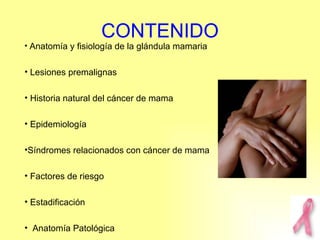 El documento describe la anatomía y fisiología de la glándula mamaria, incluyendo su irrigación sanguínea y linfática. Explica las lesiones premalignas como la hiperplasia ductal atípica y su asociación con un mayor riesgo de cáncer de mama. También resume la epidemiología del cáncer de mama, señalando que es el cáncer más común en mujeres y la segunda causa global de muerte por cáncer.