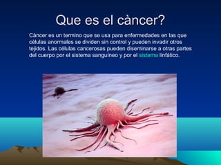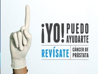 El documento describe el cáncer de próstata, incluyendo sus causas, síntomas y métodos de detección. El cáncer de próstata se desarrolla lentamente y afecta principalmente a hombres mayores de 70 años. Las pruebas de detección incluyen exámenes de PSA en sangre y biopsias de próstata. Los síntomas pueden incluir dificultades para orinar. La prevención implica exámenes médicos frecuentes a medida que los hombres envejecen y tienen un mayor riesgo de c