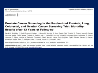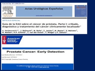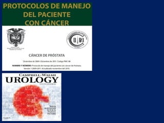 El documento presenta información sobre el cáncer de próstata, incluyendo su anatomía, factores de riesgo, fisiopatogenia y epidemiología. Describe que la próstata es una glándula que rodea la uretra y que puede verse afectada por neoplasias benignas o malignas. Explica que factores genéticos y ambientales influyen en el riesgo de desarrollar cáncer de próstata y que éste se diagnostica con mayor frecuencia en hombres mayores de 65 años. Además, resume que la inflamación, in