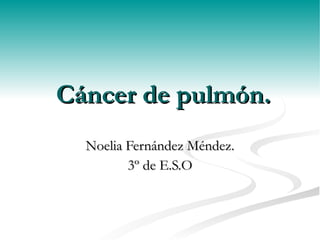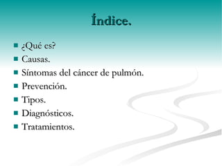 Este documento resume el cáncer de pulmón, incluyendo sus causas principales como el tabaco, síntomas como la tos con sangre, tipos como el adenocarcinoma y el carcinoma de células pequeñas, diagnósticos a través de rayos X y broncoscopia, y tratamientos como la cirugía, quimioterapia y radioterapia.