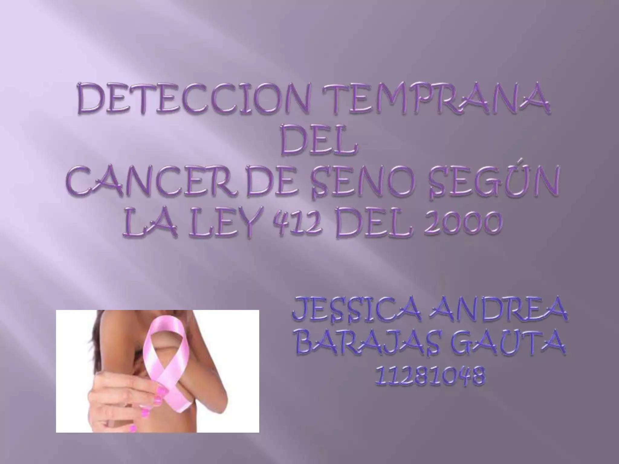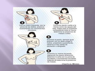 Este documento describe varios métodos para la detección temprana del cáncer de mama, incluyendo el autoexamen, la mamografía, el ultrasonido y la toma de muestras de tejido. Recomienda que las mujeres realicen autoexámenes mensuales después de los 20 años y mamografías a partir de los 40 años para identificar masas sospechosas de manera oportuna y permitir un tratamiento temprano.