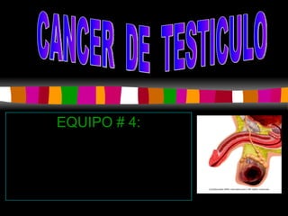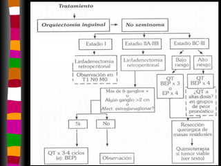 El cáncer de testículo es más común entre los 15-34 años y representa el 1% de los cánceres en hombres. Se diagnostica mediante orquiectomía y análisis de marcadores tumorales. El tratamiento depende del estadio y puede incluir cirugía, quimioterapia y radioterapia. Los factores de riesgo son criptorquidia, antecedentes familiares y cáncer testicular previo.