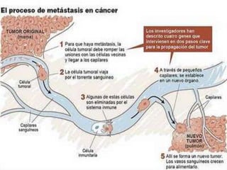 Este documento trata sobre oncología. Explica los mecanismos del crecimiento tumoral como la diferenciación celular, el ciclo celular y la apoptosis. Distingue entre tumores benignos como papilomas y adenomas, y tumores malignos como carcinomas y sarcomas. También describe las características y clasificación de tumores benignos y malignos, así como las localizaciones habituales de las metástasis de diferentes tumores primarios.