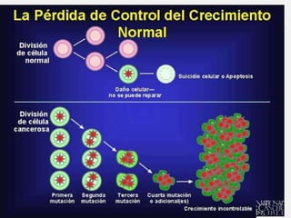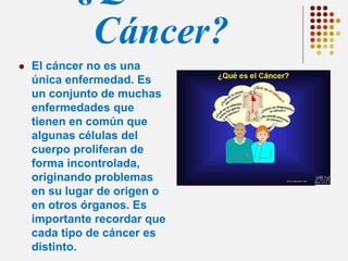 Este documento ofrece una introducción general al cáncer. Explica que el cáncer no es una sola enfermedad, sino muchas enfermedades relacionadas por el crecimiento anormal de células. Detalla los diferentes tipos de cáncer y cómo se nombran. También discute factores que contribuyen al desarrollo del cáncer como el tabaco, la radiación, virus y la herencia genética. Finalmente, resume tratamientos comunes como la quimioterapia y la radioterapia, así como sus efectos secundarios.