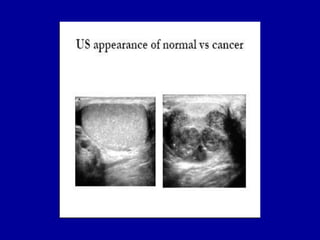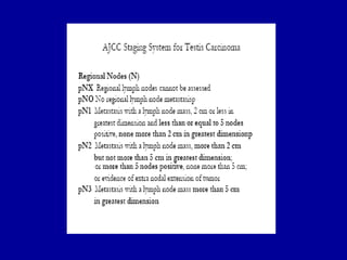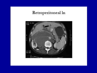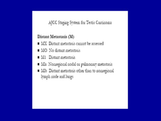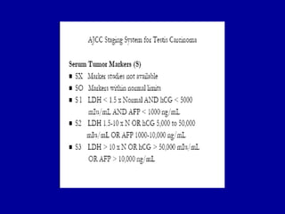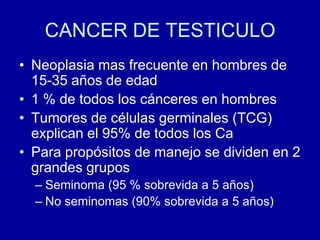 Este documento resume información sobre el cáncer de testículo. Es el tumor más común en hombres entre 15-35 años y representa alrededor del 1% de todos los cánceres en hombres. Los tumores de células germinales representan el 95% de los casos y se dividen en seminomas y no seminomas. Los factores de riesgo incluyen criptorquidia, antecedente personal de cáncer testicular, e infección por VIH. La evaluación incluye ultrasonido testicular, marcadores tumorales y TAC. El pronóstico de
