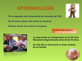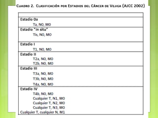 El cáncer de vejiga es una proliferación anormal de células en la vejiga que puede invadir tejidos. Es común en hombres mayores de 65 años y su causa principal es el tabaquismo. El diagnóstico incluye exámenes de orina, cistoscopia y biopsia, y su tratamiento depende del estadio y grado, incluyendo cirugía, quimioterapia, inmunoterapia e radioterapia.