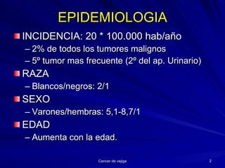 El documento proporciona información sobre el cáncer de vejiga, incluyendo su epidemiología, etiología, diagnóstico, tratamientos y pronóstico. Explica que los factores de riesgo incluyen la exposición a carcinógenos ocupacionales y el tabaco, y que el diagnóstico temprano es importante. Los tratamientos descritos son la resección transuretral, instilaciones intravesicales de quimioterapia o BCG, radioterapia, cirugía y quimioterapia sistémica.