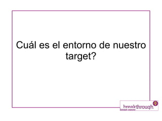 El documento describe el objetivo de una campaña de concienciación sobre el cáncer de mama dirigida a mujeres mayores de 50 años en España. Explica que este grupo demográfico se preocupa mucho por su apariencia física y la belleza, pero a menudo se olvida de su salud interna. La campaña pretende crear conciencia sobre la importancia de la detección precoz del cáncer de mama mediante acciones en gimnasios, spas, tiendas de cosméticos y revistas femeninas que promuevan exámenes regulares