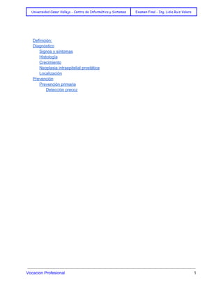 Este documento describe el cáncer de próstata, incluyendo su definición, signos y síntomas, factores de riesgo, detección, tratamiento y prevención. El cáncer de próstata se desarrolla en la glándula prostática y puede causar dolor y dificultad para orinar. La detección incluye exámenes de PSA y tacto rectal. Aunque la mayoría crece lentamente, en algunos casos puede propagarse a otros órganos. La dieta, los suplementos vitamínicos y los antiinflam