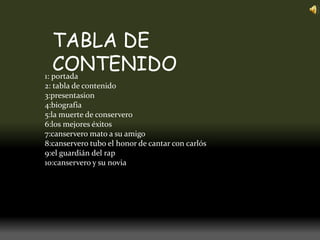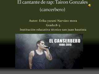 El documento presenta la biografía y carrera del rapero venezolano Canserbero, subrayando sus inicios en la música y los desafíos personales que enfrentó. Su trágica muerte en 2015, tras presuntamente asesinar a su amigo Carlos Molnar y posteriormente suicidarse, marca un giro sombrío en su historia. Además, se menciona su legado musical y su impacto en la escena del rap en Venezuela.