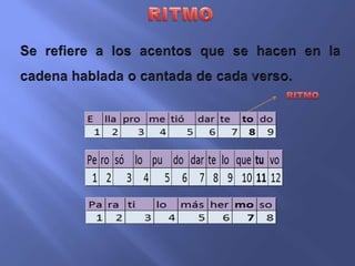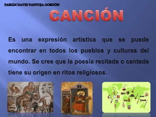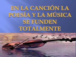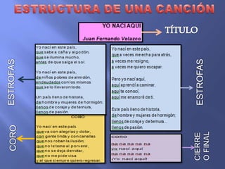 Este documento analiza diferentes aspectos de las canciones ecuatorianas como el lenguaje empleado, los criterios de origen, influencias, usos y géneros musicales. También describe elementos poéticos como la rima, figuras literarias y recomendaciones para la interpretación. Finalmente, presenta extractos de canciones populares ecuatorianas que ilustran estos conceptos.